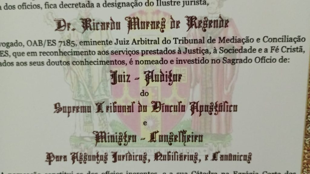 O Supremo Tribunal do Vinculo Apostólico e a Corte dos Magistrados da Cúria nomeia o Dr. Ricardo M. Resende para a posição de JUIZ-AUDITOR e MINISTRO-CONSELHEIRO DOM RICARDO I 10 meses atrás