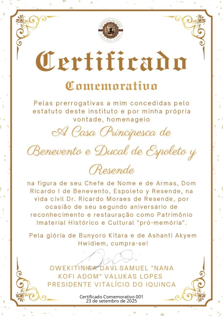 Certificado Comemorativo do Instituto IQUINCA ao Aniversário da Casa Principesca de Benevento DOM RICARDO I 6 meses atrás