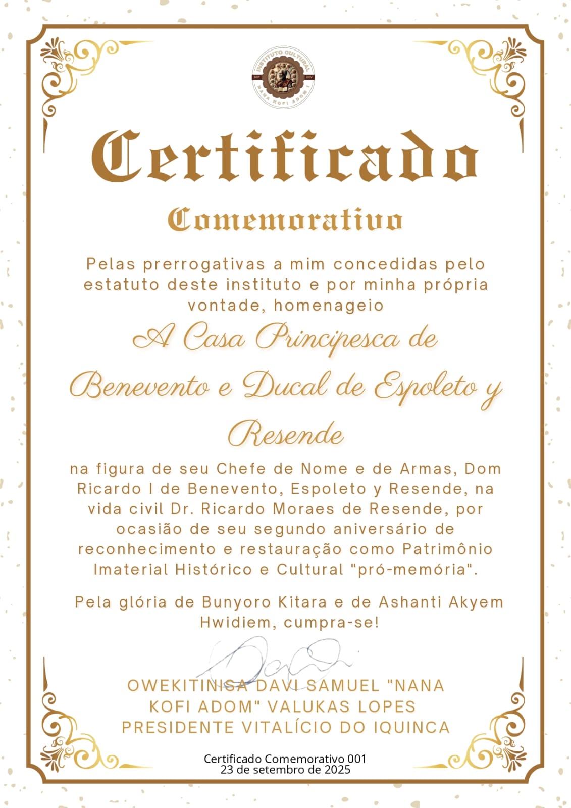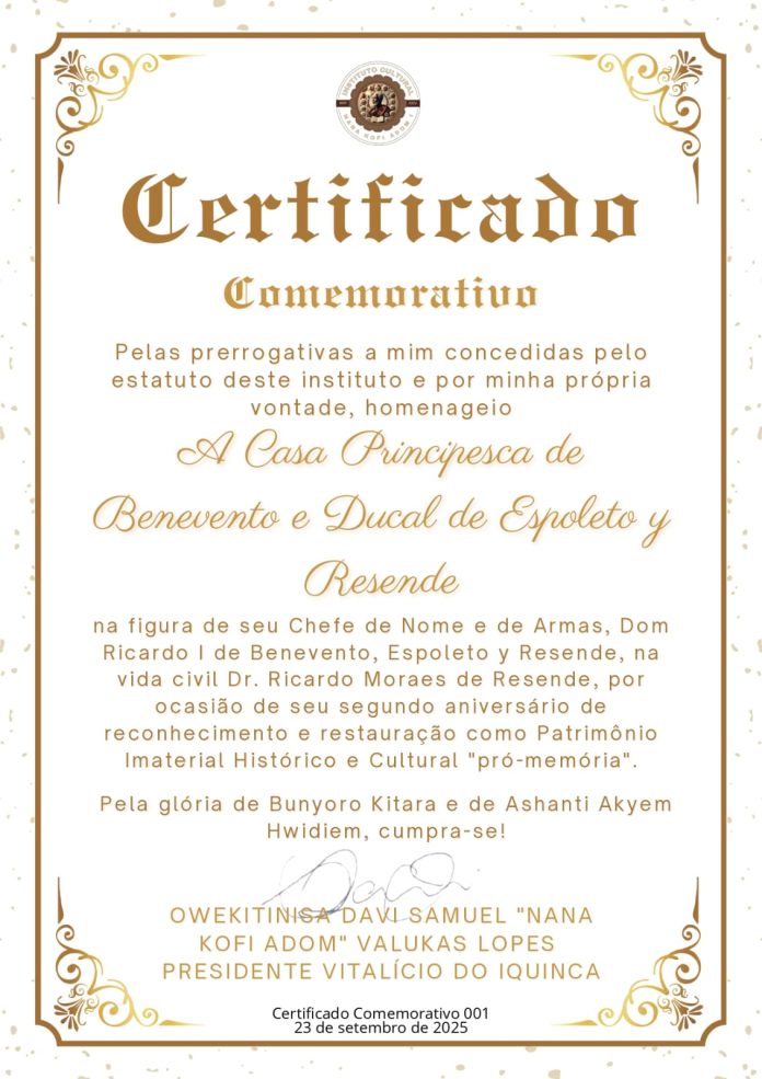 InícioMUNDOCertificado Comemorativo do Instituto IQUINCA ao Aniversário da Casa Principesca de... MUNDO Certificado Comemorativo do Instituto IQUINCA ao Aniversário da Casa Principesca de Benevento By DOM RICARDO I setembro 25, 2025 1 143 Compartilhado FacebookTwitterPinterestWhatsApp Compartilhado FacebookTwitterPinterestWhatsApp Artigo anteriorCongratulações do Soberano da Casa Marquesal de Sória pelo Aniversário da Casa Principesca de BeneventoPróximo artigoCongratulações do Soberano da Casa Condal de Luz pelo Aniversário da Casa Principesca de Benevento DOM RICARDO Ihttps://casarealbenevento.com.br RELATED ARTICLES MUNDO O Presidente Akiiki Amon Tumuhaise da Empagi Za Bunyoro Kweteeraniza concede o título de Akiiki a Dom Ricardo I de Benevento abril 3, 2026 MUNDO Tratado Bilateral de Amizade e Cooperação Cutural e de Reconhecimento Recíproco abril 3, 2026 MUNDO Comuni in provincia di Benevento in Italia março 27, 2026 1 COMENTÁRIO Parabéns! Responder DEIXE UMA RESPOSTA Cancelar resposta Comentário: Por favor digite seu comentário! Nome:* Por favor, digite seu nome aqui E-mail:* Você digitou um endereço de e-mail incorreto! Por favor, digite seu endereço de e-mail aqui Site: Salve meu nome, e-mail e site neste navegador para a próxima vez que eu comentar. - Advertisment - Most Popular O Presidente Akiiki Amon Tumuhaise da Empagi Za Bunyoro Kweteeraniza concede o título de Akiiki a Dom Ricardo I de Benevento abril 3, 2026 Tratado Bilateral de Amizade e Cooperação Cutural e de Reconhecimento Recíproco abril 3, 2026 Comuni in provincia di Benevento in Italia março 27, 2026 S.B.S. Mons. Dom +++ Luciano Melo Depes março 23, 2026 Carregar maisComentáriosLeandro Fabricius da Silva Carneiro em Tratado Bilateral de Amizade e Cooperação Cutural e de Reconhecimento RecíprocoLeandro Fabricius da Silva Carneiro em O Presidente Akiiki Amon Tumuhaise da Empagi Za Bunyoro Kweteeraniza concede o título de Akiiki a Dom Ricardo I de BeneventoLeandro Fabricius da Silva Carneiro em Comuni in provincia di Benevento in ItaliaDom Guilherme da Cunha em Duque de Spoleto y Resende um Legado de Sangue e Pró-memória de viva representação da Nobreza Histórica em ExílioDom Guilherme da Cunha em Sociedade Civil Cultural do Circulo Monárquico Barão de Itapevi do Movimento Monárquico do Estado do Espírito Santo