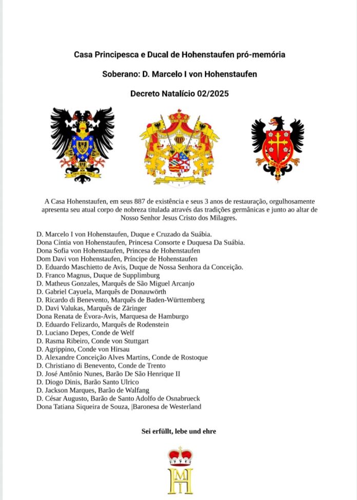 InícioMUNDODecreto Natalício de SAIR Dom Marcelo I apresentando seu novo Corpo... MUNDO Decreto Natalício de SAIR Dom Marcelo I apresentando seu novo Corpo de Nobreza da Casa Principesca e Ducal Hohenstaufen By DOM RICARDO I novembro 17, 2025 0 117 Compartilhado FacebookTwitterPinterestWhatsApp Compartilhado FacebookTwitterPinterestWhatsApp Artigo anteriorEnsino de música para crianças: benefícios para o desenvolvimento cognitivo, emocional e socialPróximo artigoDom Ricardo Moraes de Resende novo Marquês von Baden Wurttenberg da Casa Principesca e Ducal Hohenstaufen DOM RICARDO Ihttps://casarealbenevento.com.br RELATED ARTICLES MUNDO O Presidente Akiiki Amon Tumuhaise da Empagi Za Bunyoro Kweteeraniza concede o título de Akiiki a Dom Ricardo I de Benevento abril 3, 2026 MUNDO Tratado Bilateral de Amizade e Cooperação Cutural e de Reconhecimento Recíproco abril 3, 2026 MUNDO Comuni in provincia di Benevento in Italia março 27, 2026 DEIXE UMA RESPOSTA Cancelar resposta Comentário: Por favor digite seu comentário! Nome:* Por favor, digite seu nome aqui E-mail:* Você digitou um endereço de e-mail incorreto! Por favor, digite seu endereço de e-mail aqui Site: Salve meu nome, e-mail e site neste navegador para a próxima vez que eu comentar. - Advertisment - Most Popular O Presidente Akiiki Amon Tumuhaise da Empagi Za Bunyoro Kweteeraniza concede o título de Akiiki a Dom Ricardo I de Benevento abril 3, 2026 Tratado Bilateral de Amizade e Cooperação Cutural e de Reconhecimento Recíproco abril 3, 2026 Comuni in provincia di Benevento in Italia março 27, 2026 S.B.S. Mons. Dom +++ Luciano Melo Depes março 23, 2026 Carregar maisComentáriosLeandro Fabricius da Silva Carneiro em Tratado Bilateral de Amizade e Cooperação Cutural e de Reconhecimento RecíprocoLeandro Fabricius da Silva Carneiro em O Presidente Akiiki Amon Tumuhaise da Empagi Za Bunyoro Kweteeraniza concede o título de Akiiki a Dom Ricardo I de BeneventoLeandro Fabricius da Silva Carneiro em Comuni in provincia di Benevento in ItaliaDom Guilherme da Cunha em Duque de Spoleto y Resende um Legado de Sangue e Pró-memória de viva representação da Nobreza Histórica em ExílioDom Guilherme da Cunha em Sociedade Civil Cultural do Circulo Monárquico Barão de Itapevi do Movimento Monárquico do Estado do Espírito Santo