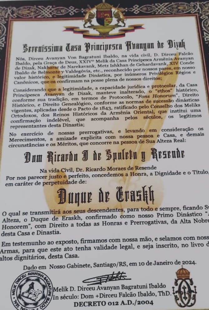 É uma honra ter sido abençoado por esta estimada e Sererenissíma Casa Principesca de Avanyan de Dizak, que tenho hoje o meu primo e Patriarca Bispo Episcopal o Melik Dom Dirceu Ibaldo Falcão , na qual tenho com a mais elevada estima e apreço. Que o Senhor Deus em Cristo Jesus continue lhe abençoando sempre a sua Familia Real e vida Ministerial.